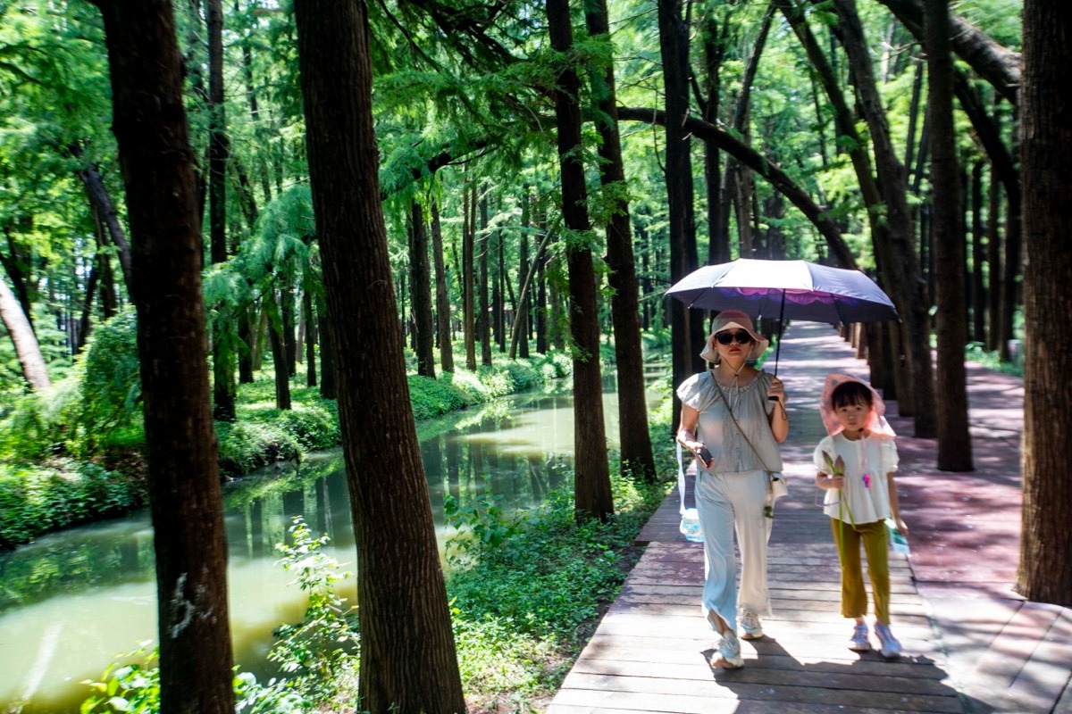 8月15日,游客在江苏泰州兴化市里下河国家湿地公园游玩。