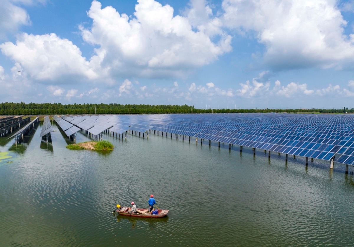 8月15日,渔民在江苏泰州兴化市千垛镇“渔光互补”光伏发电项目基地对鱼塘围网进行补桩扶桩。
