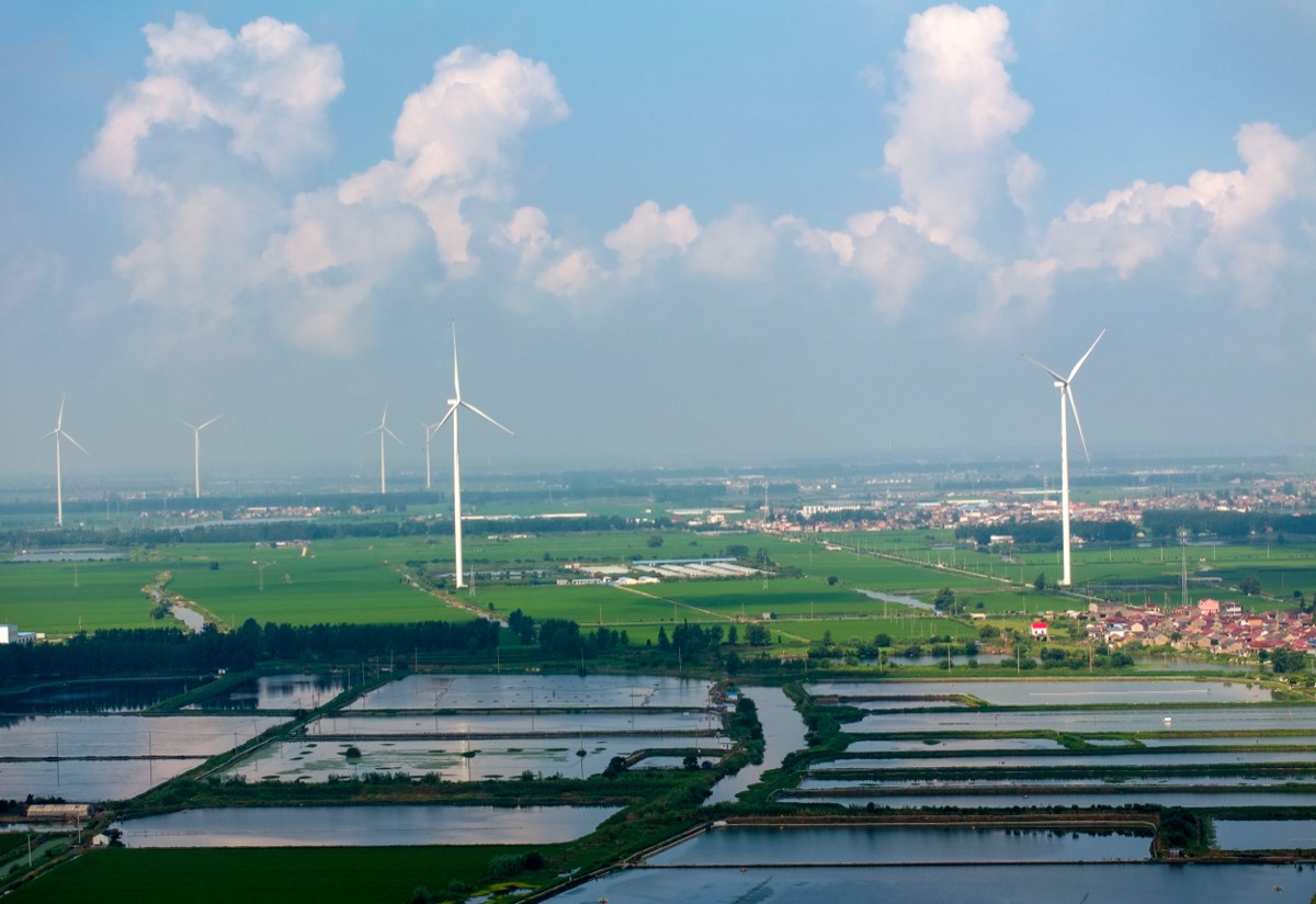 8月15日,在江苏泰州兴化市经济开发区拍摄的风电与田野、蓝天白云相映成趣。