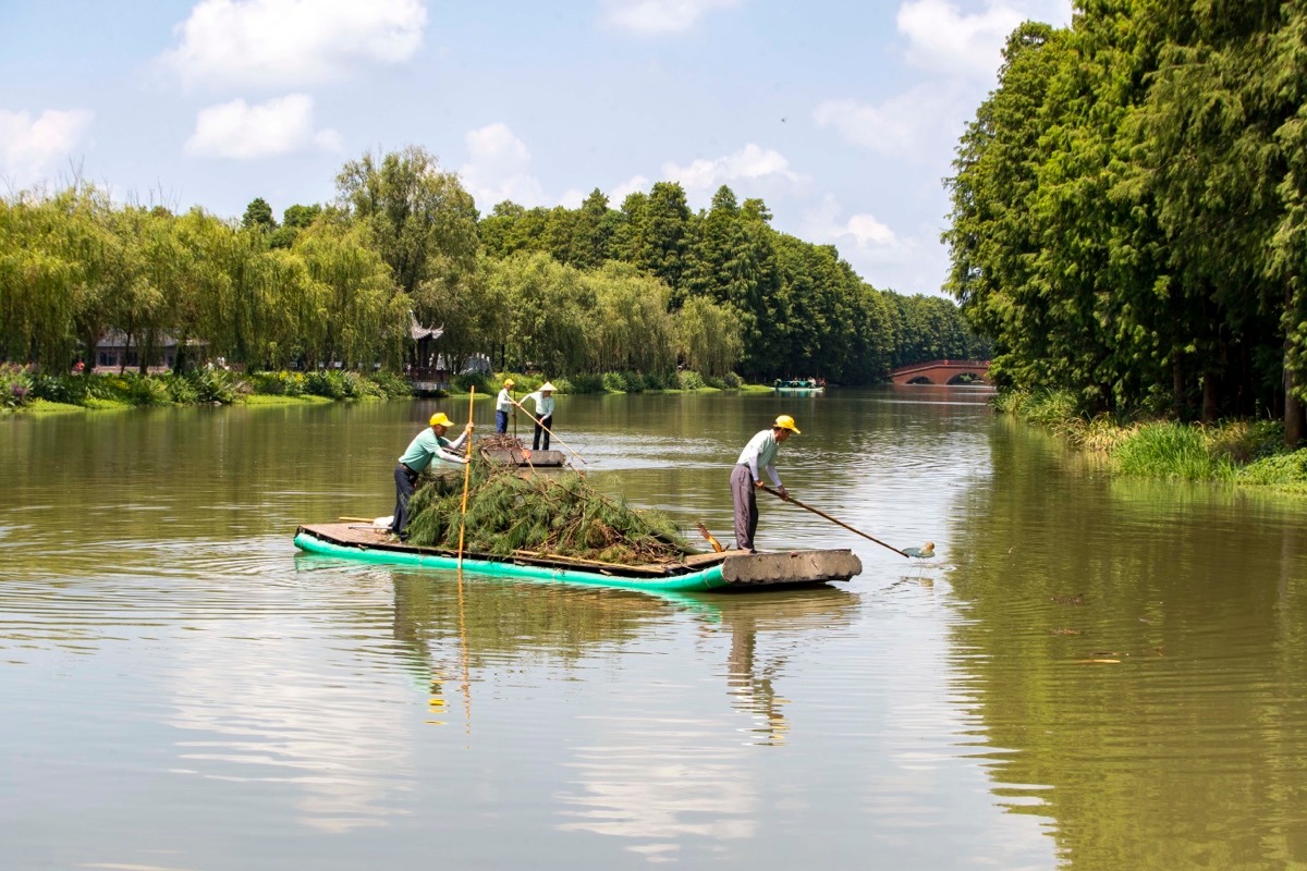 8月15日,志愿者在江苏泰州兴化市里下河国家湿地公园清理水面垃圾。