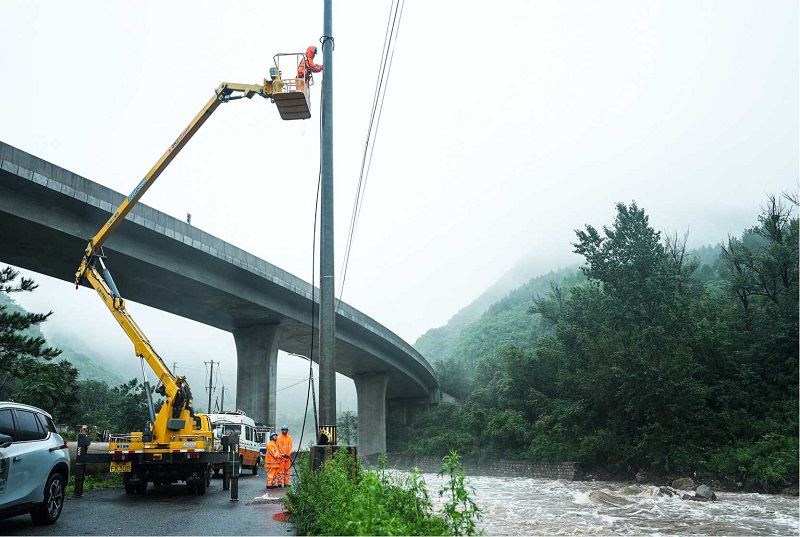 国网北京电力员工赶往受洪水影响的线路抢修现场。