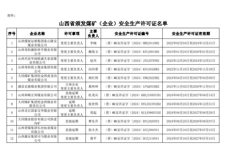 山西省应急管理厅关于颁发煤矿(企业)安全生产许可证的公告