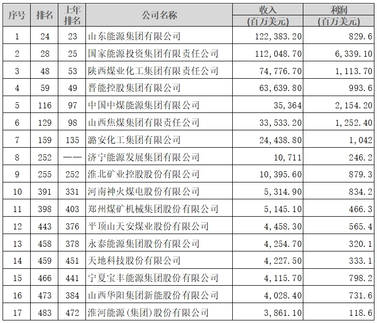 本次有17家煤炭类公司跻身2024年《财富》中国500强,较去年减少3家,济宁能源为新上榜公司,另陕煤集团和郑煤机集团排名较上年有所提升,其余上榜公司排名均较上年有所下降。具体榜单如下: