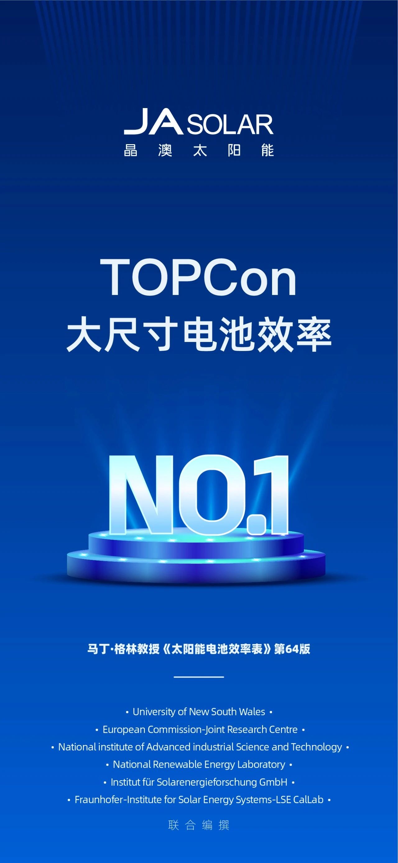 此次荣登榜单首位的晶澳科技TOPCon电池(330cm²)是目前晶澳量产电池尺寸之一,也是榜单中面积最大的电池。此次荣登榜单首位,是晶澳科技多年在光伏技术领域创新积累的体现,也充分证明了晶澳科技n型Bycium+电池技术的领先优势。该电池在组件中的应用,也将为全球客户创造更多价值,进一步推动光伏技术和市场的发展。